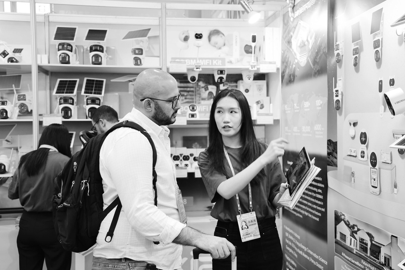 (图)4月15日,客商在广交会上选购安防产品。当日,第137届广交会开幕。本届广交会参展企业约3.1万家,其中出口展参展企业首次突破3万家,吸引超20万名境外采购商预注册。本届广交会4月15日至5月5日在广州分三期举办,分别以“先进制造”“品质家居”“美好生活”为主题。新华社记者卢汉欣/摄