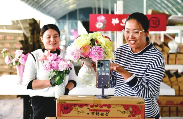 近年来,山东省菏泽市大力发展芍药鲜切花产业,年产芍药鲜切花1.2亿枝左右,已成为我国主要的芍药鲜切花生产基地。如今,牡丹产业和芍药鲜切花产业已成为菏泽市助推乡村振兴的特色主导产业。图为在菏泽市鲁西新区吕陵镇芍药鲜切花生产基地,电商主播在直播推介芍药花。新华社记者郭绪雷/摄