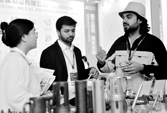 四月二十一日,国外采购商在了解紧固件产品信息。当日,为期三天的二○二五永年紧固件产业博览会在河北省邯郸市永年区开幕,吸引两百多家紧固件企业和十余个国家的采购商参展。邯郸市永年区被誉为﹃中国紧固件之都﹄。二○二四年,永年区紧固件产业集群年产量七百一十万吨,产值超五百亿元。新华社记者王晓/摄