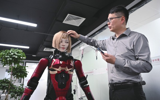 在数字华夏(深圳)科技有限公司,工作人员展示人形机器人夏澜。一系列重大科技基础设施加速布局,高端科研人才加速汇聚;无人机、新能源汽车、生物医药等新兴产业蓬勃发展,一批具有国际竞争力的创新型企业不断涌现;制度创新,则为新质生产力发展提供坚实保障……粤港澳大湾区正以新质生产力为突破口,在深化开放合作中加速迈向国际一流湾区。新华社记者邓华/摄
