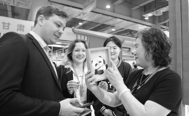 4月27日,采购商(左一、左二)在活动现场向参展商了解湘绣技艺。当日,“2025湖南内外贸一体化融合发展博览会暨外贸优品中华行湖南站”在湖南株洲国际会展中心正式启动。本届博览会为期三天,以“助力双循环、拓展新市场、促进新消费”为主题,依托6.5万平方米的展陈空间进行展销展示,吸引中外600余家参展商到场。新华社记者薛宇舸/摄