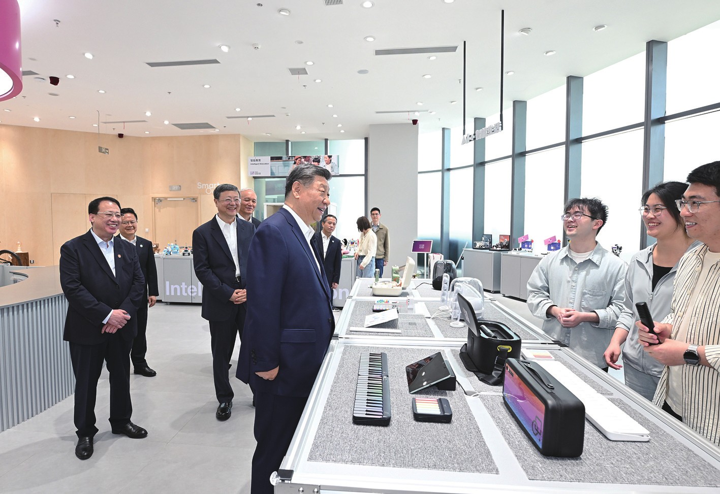 随后,习近平走进人工智能产品体验店。柜台上,智能眼镜、智能儿童玩具、智能乐器等创新产品琳琅满目,习近平详细了解产品功能和市场行情,还饶有兴致地戴上智能眼镜亲身体验。他表示,我国数据资源丰富,产业体系完备,市场空间巨大,发展人工智能前景广阔,要加强政策支持和人才培养,努力开发更多安全可靠的优质产品。