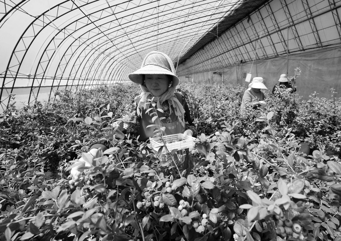 4月25日,河北省卢龙县刘田各庄镇孙田各庄村胜行家庭农场的工人在大棚内采摘有机蓝莓。