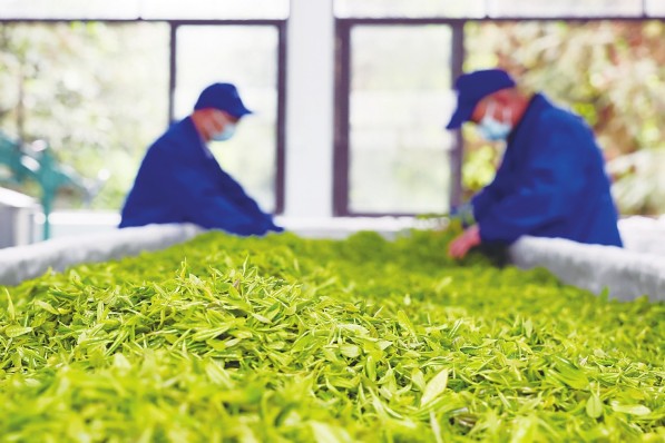 近年来,重庆市綦江区石角镇新农村立足绿色生态资源禀赋,将茶产业打造成助力乡村振兴的主导产业,通过“村集体经济+公司+农户”的发展模式,对茶园管理及茶叶收购、加工、销售等环节进行统一管理,现已建成420亩标准生态茶园和3个茶叶加工车间,年生产成品茶上万斤,“绿叶子”成为了致富的“金叶子”。图为茶叶加工车间,制茶工人对新鲜采摘的茶叶进行摊晾。新华社发兰红光/摄