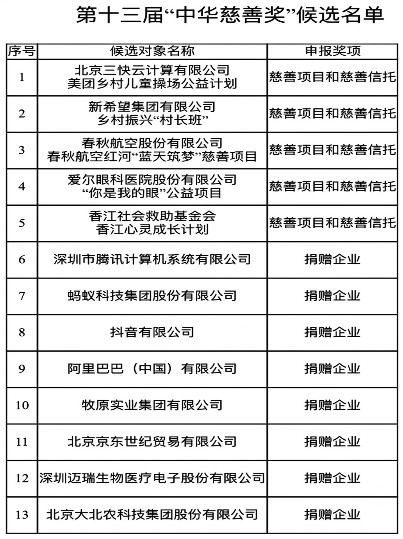 关于第十三届“中华慈善奖”候选名单的公示