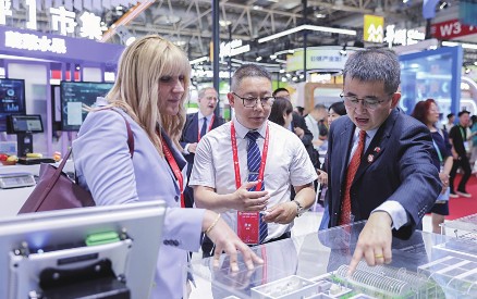 (图)链博会上金马衡器总经理周欣(中)为外国客人介绍金马衡器项目。金马衡器供图