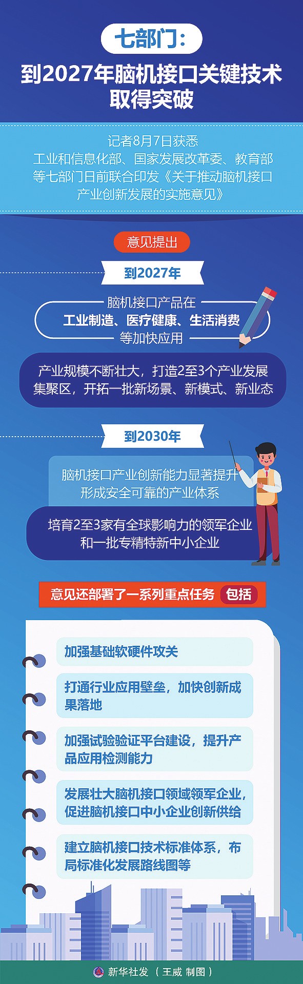 脑机接口,作为一项未来产业和智能时代不可或缺的硬核科技,正得到大力扶持。日前,工业和信息化部、国家发展改革委等七部门联合发布《关于推动脑机接口产业创新发展的实施意见》(简称《意见》),提出到2027年、2030年两步走发展目标,明确五大重点任务,细化17项具体举措,进一步推动脑机接口产业高质量发展,加快培育形成未来产业新赛道。