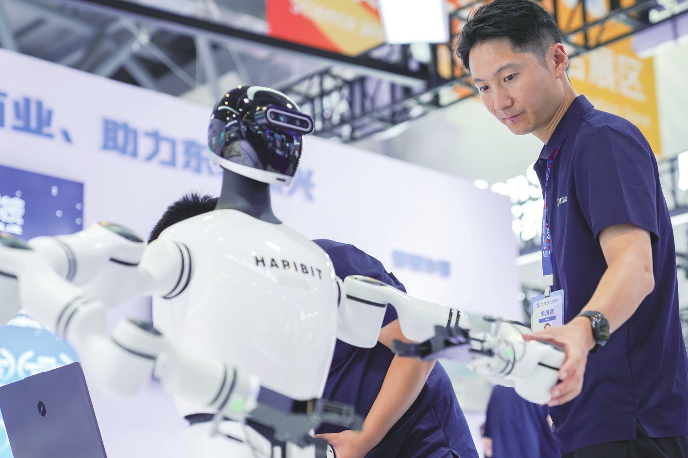 8月27日,工作人员在第十五届中国-东北亚博览会现代化产业馆内调试展出的具身智能机器人产品。8月27日,第十五届中国-东北亚博览会在吉林长春开幕。新华社记者许畅/摄