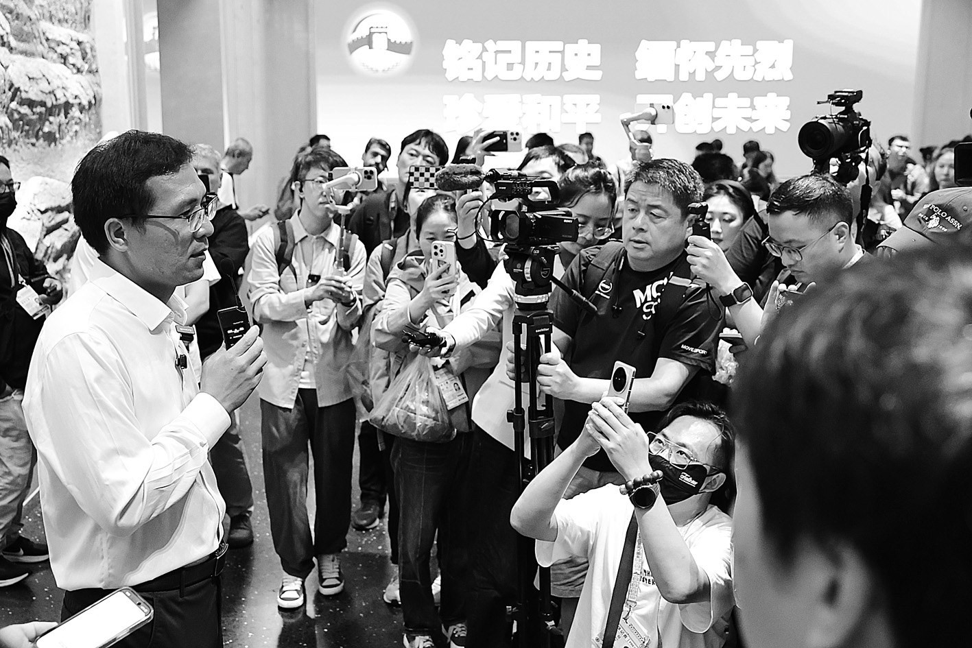 八月二十七日,中外媒体记者在中国人民抗日战争纪念馆内采访。八月二十七日,中国人民抗日战争暨世界反法西斯战争胜利八十周年纪念活动新闻中心举行首场外出参观采访活动,组织近二百名境内外记者赴中国人民抗日战争纪念馆等地参观采访,观看《为了民族解放与世界和平——纪念中国人民抗日战争暨世界反法西斯战争胜利八十周年》主题展览。参加活动的记者来自六十多个国家和地区的一百三十余家境内外媒体。新华社记者张玉薇/摄