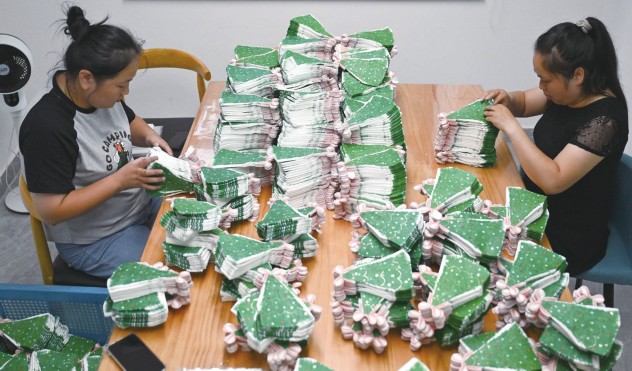 近日,在和县历阳镇禹锡社区“禹邻工坊”,社区居民在包装纸巾。今年以来,安徽省马鞍山市和县积极整合企业资源和社区人力优势,打造时间自由、灵活多样的社区“微工坊”,按照“社区搭台、企业派单、居民接单”的模式,既解决了企业用工需求,又帮助社区居民“家门口就业”,实现照顾家庭和增收两不误。新华社记者黄博涵/摄