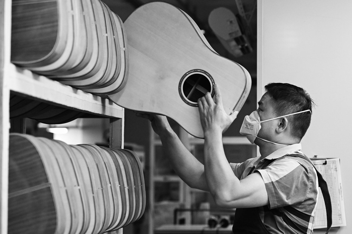 日前,在湖北省松滋市一家吉他企业生产车间,工人在制作吉他。