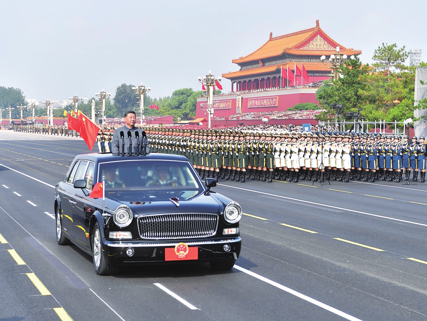 雄壮的军乐声中,习近平乘车沿着宽阔的长安街,依次检阅13个徒步方队、1个战旗方队、22个装备方队。受阅部队军容严整、意气风发,铁甲战车整齐列阵、威风凛凛。这是人民军队奋进建军百年的崭新亮相,这是中华民族捍卫世界和平的坚定宣示。