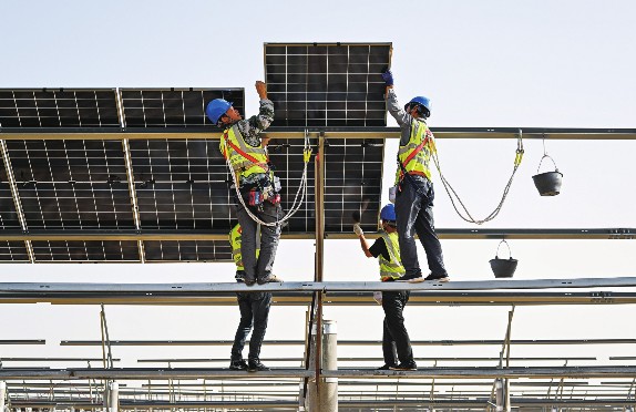工人在库布其沙漠里的杭锦旗朔方新能源大基地安装光伏板。