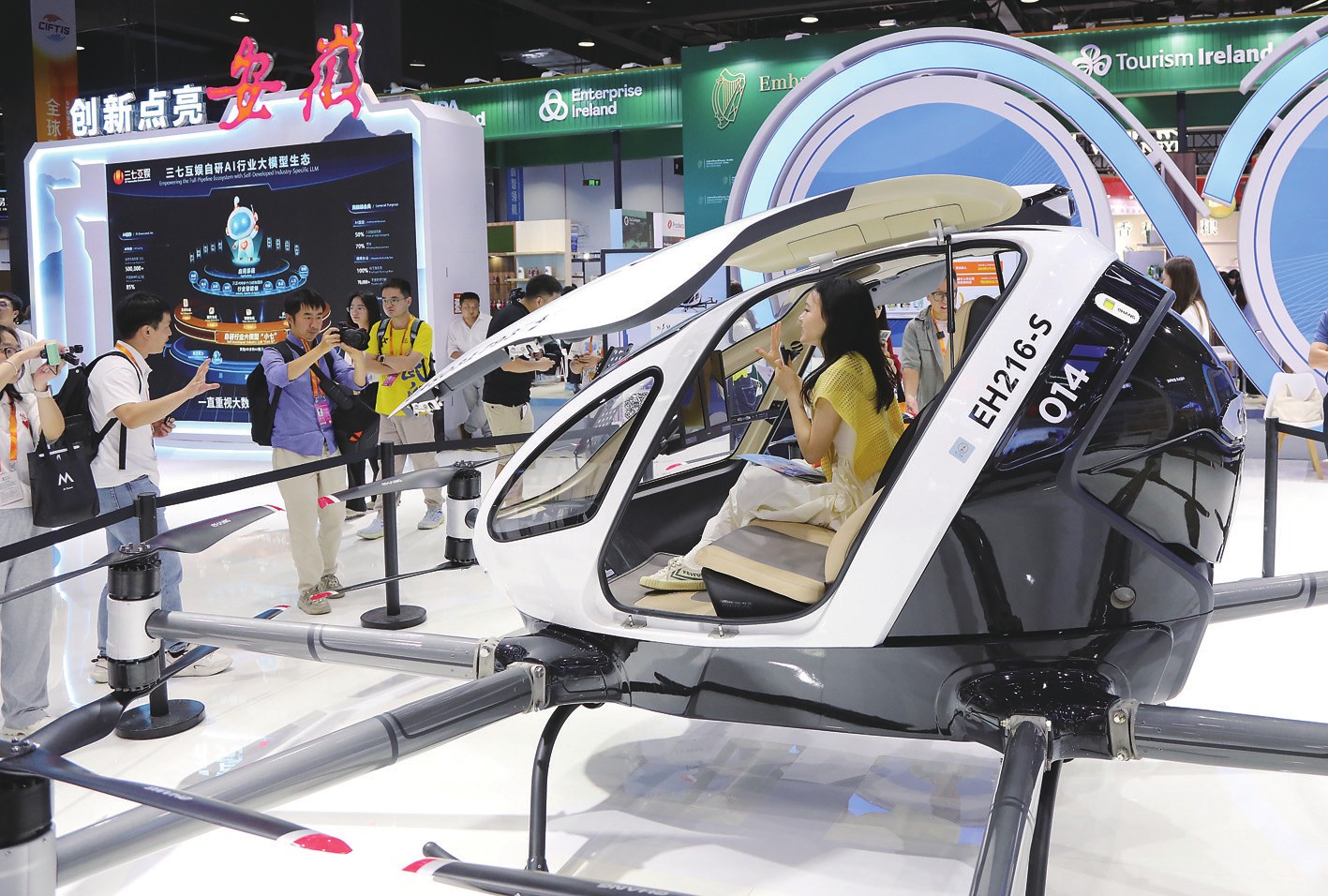 9月10日,在2025年服贸会主题展展区,一名媒体人员(右)在主宾省安徽省展台体验了解无人驾驶载人电动垂直起降航空器。9月10日,以“数智领航,服贸焕新”为年度主题的2025年中国国际服务贸易交易会在北京开幕。新华社记者侯俊/摄