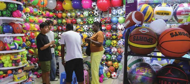 在2026年美加墨世界杯等的带动下,近期“世界超市”浙江义乌体育用品销售旺。义乌海关的统计数据显示,今年前7个月,义乌体育用品及设备出口总额达67.8亿元,同比增长16.8%;其中对美国、加拿大、墨西哥这三个世界杯主办国的出口额为18.8亿元,同比增长10%。图为9月15日,外商在浙江省义乌国际商贸城三区商铺洽谈采购球类。新华社发时宽兵/摄