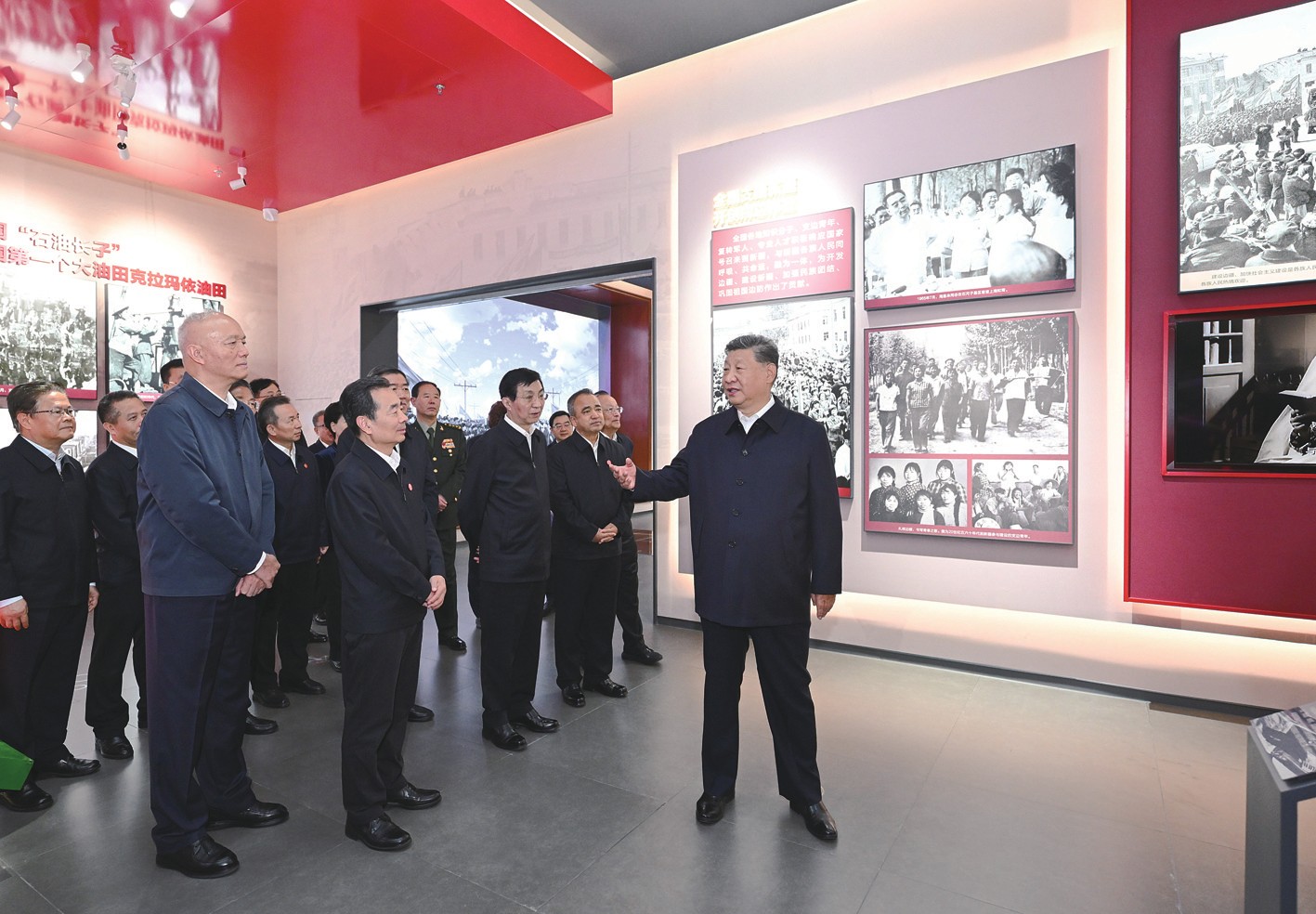 (图)九月二十四日上午,中共中央总书记、国家主席、中央军委主席习近平在乌鲁木齐文化中心展览馆参观新疆维吾尔自治区成立七十周年主题成就展。新华社记者谢环驰/摄
