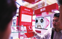 日前,工作人员为参观者介绍“连续视程散光矫正型人工晶状体”。