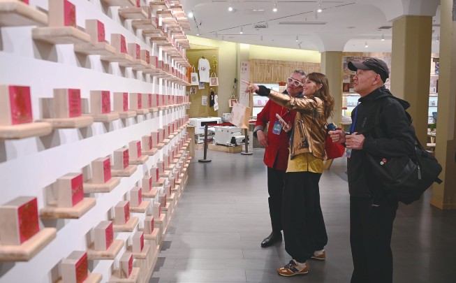10月11日,外国嘉宾在敦煌印局参观。10月11日至12日,前来参加“世界市长对话·敦煌”活动的亚美尼亚、意大利、土耳其、尼泊尔等国嘉宾走进位于甘肃省敦煌市的世界文化遗产莫高窟和敦煌印局、敦煌无界等敦煌文化新地标,感受千年敦煌的历史气息与创意文脉。新华社记者范培珅/摄