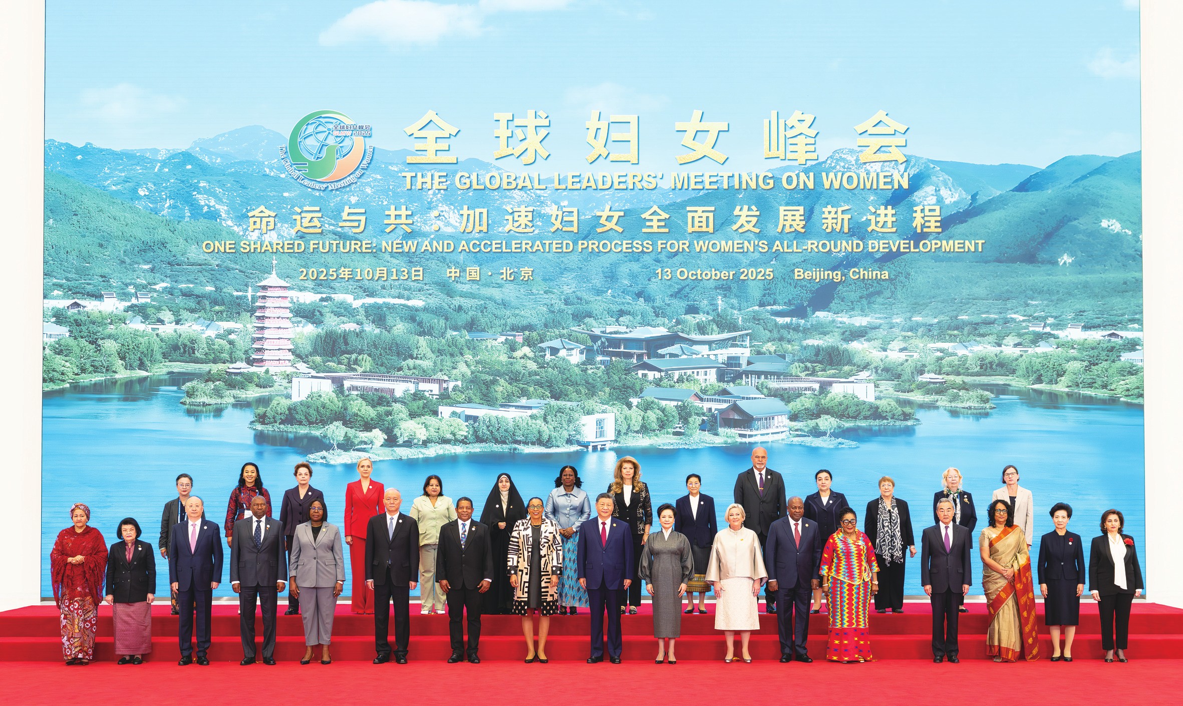 (图2)10月13日上午,国家主席习近平在北京国家会议中心出席全球妇女峰会开幕式并发表主旨讲话。这是习近平和夫人彭丽媛同与会各国和国际组织代表团团长夫妇合影留念。新华社记者黄敬文/摄