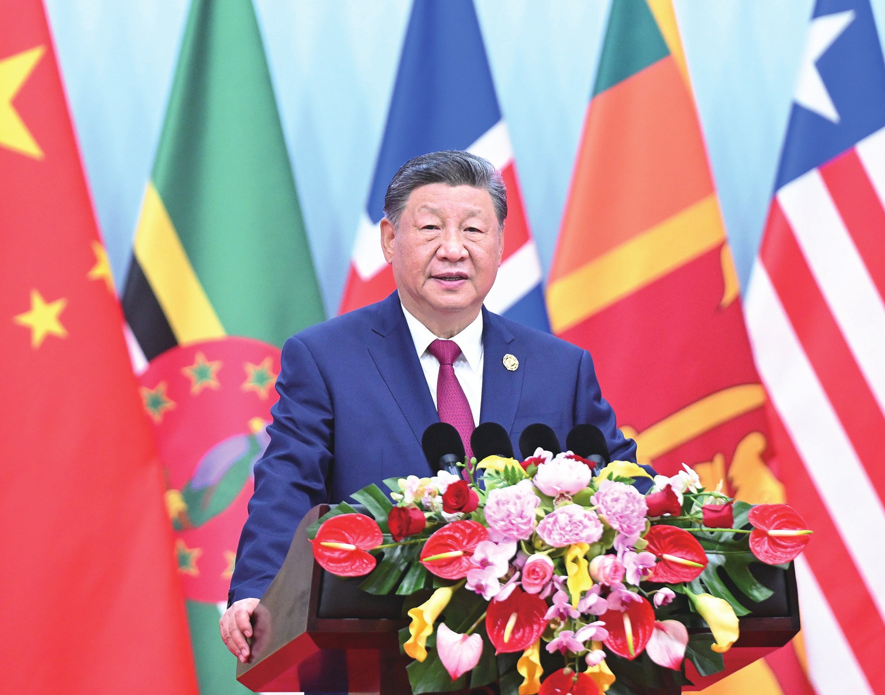 金秋时节,天朗气清。国家会议中心会场内,各国国旗和联合国旗帜组成恢弘旗阵。