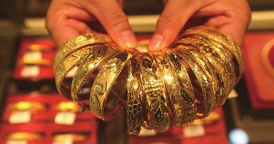 10月13日,现货黄金价格盘中突破每盎司4070美元关口,延续此前连续8周上涨的强势表现,再创历史新高。图为江苏省连云港市连云区一家黄金店内,店员在整理黄金饰品。新华社发王春/摄