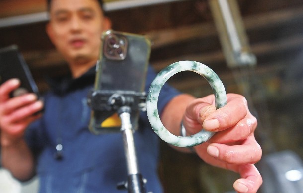 日前,在广西龙胜各族自治县三门镇大地村,村民苏绪华通过网络直播推销自己加工的玉器。