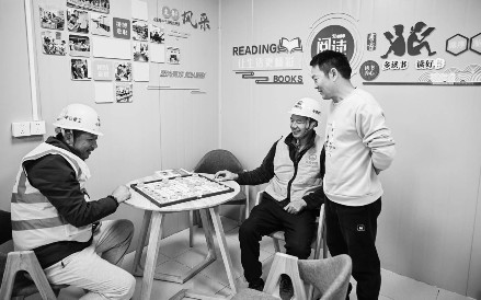 11月25日,工人在苏州北站新时代建筑工人社区工友之家下棋。今年2月,江苏苏州北站综合枢纽工程正式开工。为更好服务城市建设者,给他们提供安居场所,苏州市相城区联合建设单位打造苏州北站新时代建筑工人社区。据悉,该社区总占地200余亩,已建成5个项目片区、1个综合服务中心、1个流动摊贩引导点和商业配套。社区内部集中设置卫生服务站、警务室、安“薪”驿站、矛盾调解室、法律服务室等公共服务设施,并实行物业统一管理服务,努力将社区打造成工人的幸福家园。目前,中铁北京局、中铁建工、中建八局等单位的3000余名工人已顺利入住。新华社记者季春鹏/摄