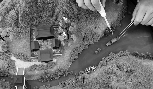 12月8日,工人在河北省石家庄市平山县上三汲乡河渠村一家沙盘企业制作沙盘。