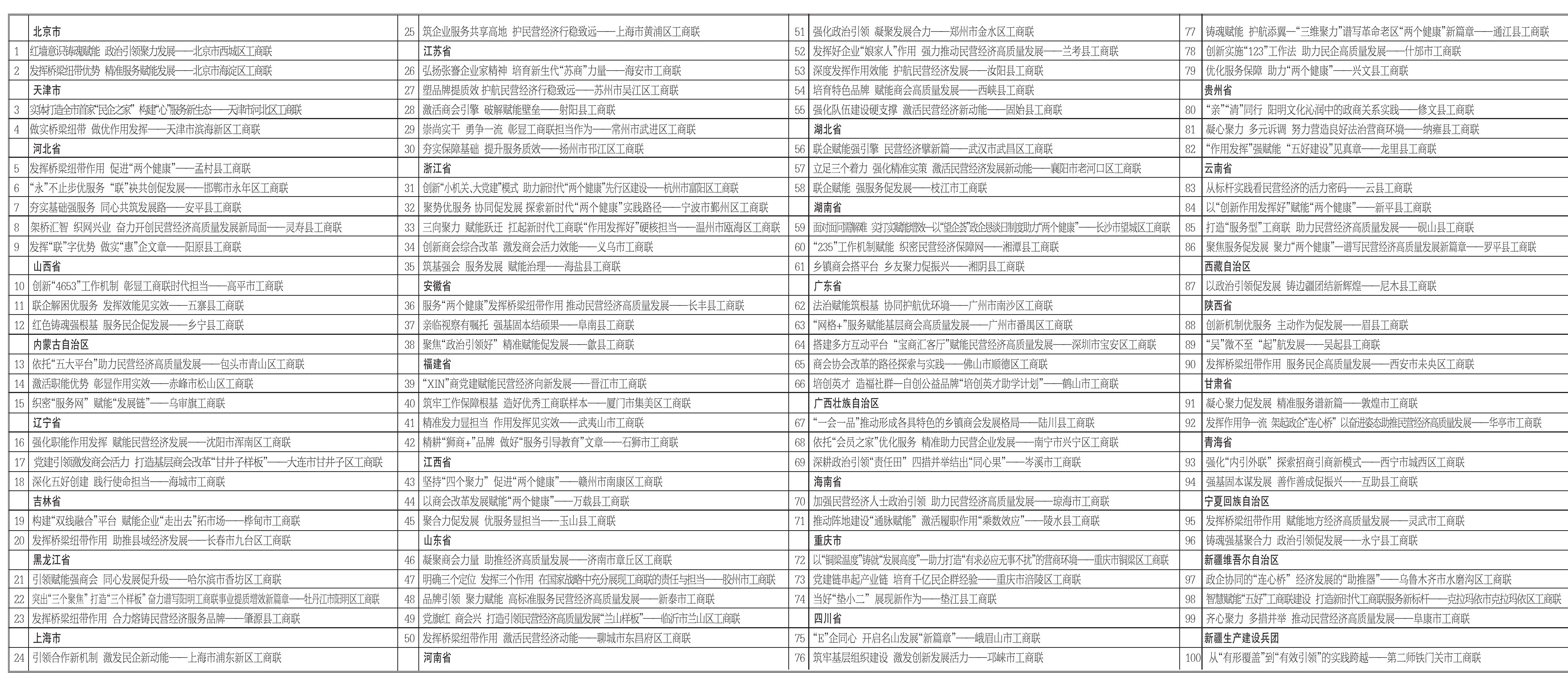 2025年,为深入贯彻落实党中央关于加强新时代工商联工作的决策部署,提高县级工商联建设水平,不断夯实工商联组织基础,健全和完善工商联组织体系,各地根据《“五好”县级工商联建设实施办法(试行)》,竞相开展了“五好”县级工商联建设工作。为展现建设成果,充分发挥典型示范引领作用,经地方工商联逐级推荐,全国工商联择优遴选出100家县级工商联建设优秀案例,予以正式发布。