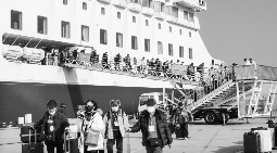 12月28日,255名韩国游客乘和谐云港轮抵达江苏连云港,开启5天中国跨年之旅。这是对韩免签政策实施以来,连云港海港客运口岸接待的最大规模韩国旅行团。图为,韩国游客乘和谐云港轮抵达江苏连云港。新华社发王健民/摄