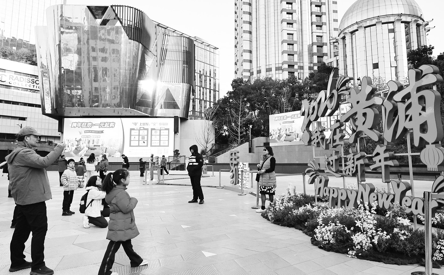 一月三日,市民游客在上海南京东路步行街世纪广场上的春节装饰前拍照。一月三日,二○二六﹃购在中国﹄暨新春消费季启动仪式在上