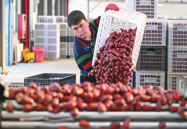 近日,在新疆和田地区墨玉县,和田源疆食品有限公司的工作人员在流水线上清洗红枣。