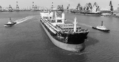 2月7日,装载着出口墨西哥的天然气公交车的货轮从山东港口烟台港起航(无人机照片)。