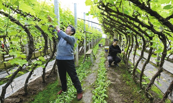 近日,河北省唐山海港经济开发区王滩镇的农民在管护大棚葡萄。