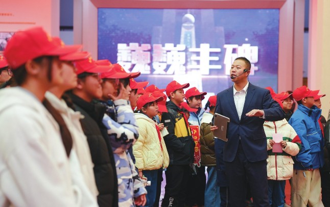 三月一日,学生在青海原子城纪念馆参观学习。三月一日,二○二六年春季学期青海省大中小学生体悟﹃两弹一星﹄精神﹃开学第一课﹄在青海原子城纪念馆举行。近五百名师生在原子城开展沉浸式实践教学活动,通过实地参观、现场讲解等方式,理解﹃两弹一星﹄精神丰富内涵和时代价值,厚植爱国主义情怀。新华社记者张龙/摄