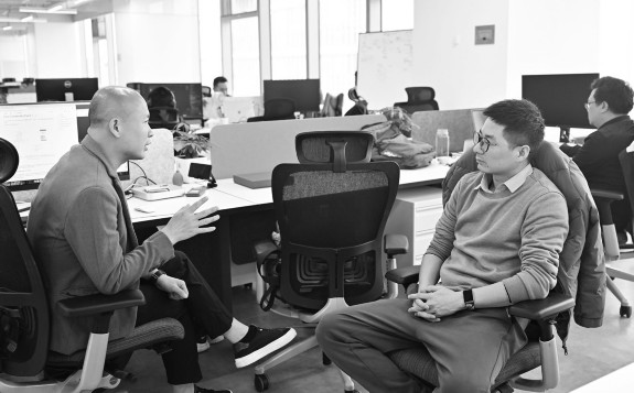 日前,在位于南京河西中央科创区的阿里中心亲橙OPC社区,昱脉科技创始人王鹏(右)和相邻工位的创业者交流。