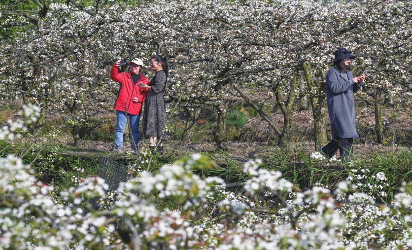 3月11日,游客在重庆市永川区尖山村打卡拍照。近日,随着气温逐步回升,重庆市永川区尖山村上万亩梨花竞相绽放,吸引众多游客前来踏青赏花。