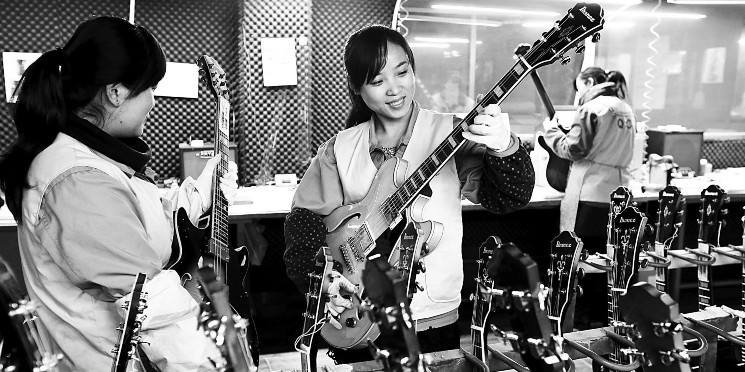 山东省枣庄市市中区民营企业在近年的发展中,通过专业培训、院校进修等多种方式,培养出服装、玩具、吉他、制造、印刷等多门类土生土长的专业设计人员2000多名。这些“草根”设计师在各自的领域中都掌握了拿手“绝活”,他们设计生产的服装、玩具、吉他等产品,不仅覆盖上海、北京、深圳、香港等国内市场,还出口到美国、英国、日本、俄罗斯、韩国等20多个国家。“草根设计”已成为当地经济发展的助推器。图为枣庄市市中区一家乐器厂的设计人员在查看设计的吉他产品。