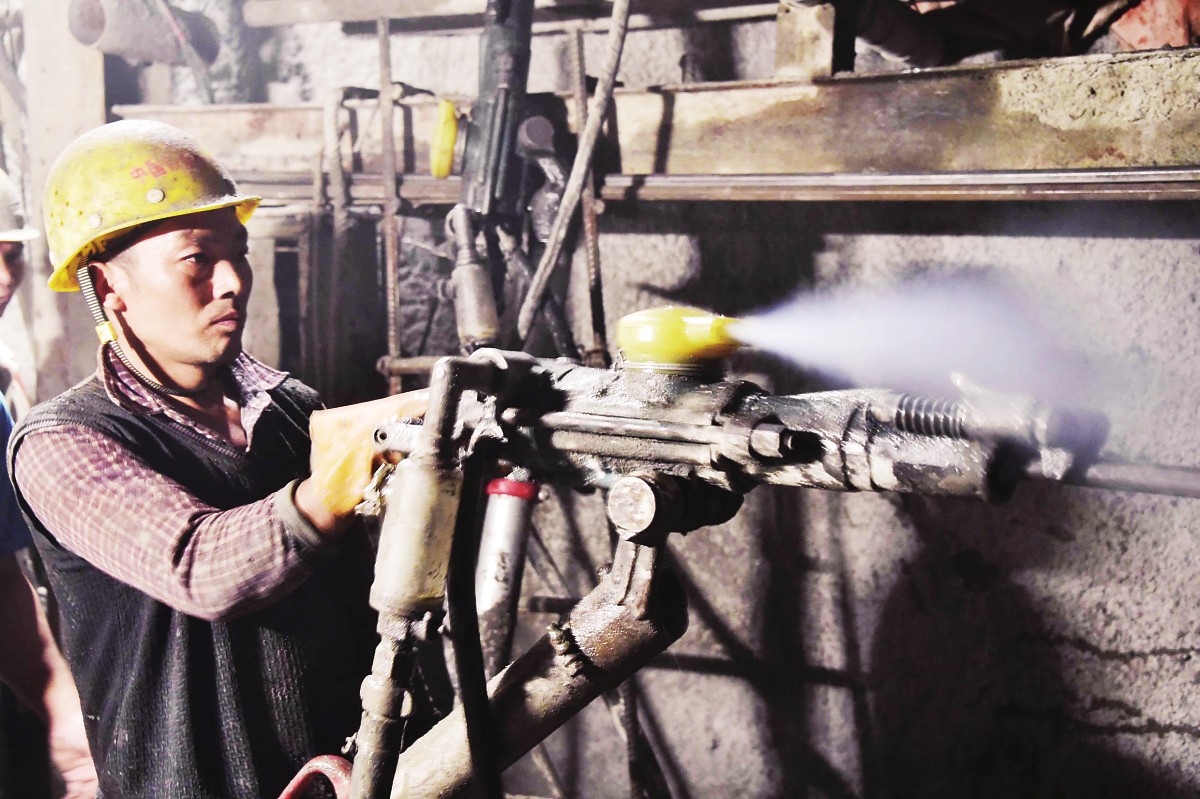 2015年底开工建设的湖北省鄂北地区水资源配置工程目前正在有序施工。该工程以丹江口水库为水源,终点为大悟县王家冲水库,线路全长269.67公里,是湖北省为了优化配置水力资源,缓解鄂北地区水资源贫乏的局面兴修的。鄂北地区泛指湖北省襄阳、随州和孝感三市的北部地区,是湖北省人口耕地相对集中的地区,夏粮产量占全省的六成左右。然而因地理位置和地形影响,降水量偏低且蓄水能力差,近几年来面临干旱频发的现实。图为工人在位于湖北省枣阳市境内的鄂北地区水资源配置工程兴隆-万福隧洞4号支洞内操作风钻。