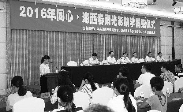 【本报漳州讯】由福建省漳州市委统战部、市工商联(总商会)、市慈善总会联合举办的“2016年同心·海西春雨光彩助学捐赠仪式”日前举行。此次活动筹得来自海口市漳州商会、苏州市漳州商会、温州市漳州商会、漳州市江西商会、漳州市家居商贸商会、漳州通用机器人有限公司、漳州市永腾家具有限公司等商会和民营企业支持的善款总计36.6万元,用于帮助98名家庭贫困学生(包括65名大学生和33名中小学生)。 今年刚考取漳州城市职业学院的许雅君同学代表全体受助学生表示,将始终怀揣一颗感恩的心,奋发图强,努力学习,以优异的成绩和表现来回报社会,回报爱心捐赠人士的帮扶之恩。 据悉,漳州市自2008年开展“同心·海西春雨光彩助学”活动以来,共募集善款9000多万元,资助2万余名贫困学生。活动旨在引导更多非公经济人士参与爱心助学活动,帮助更多学子不因贫困而辍学。(陈玉成苏志仙)
