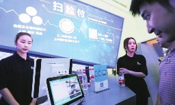 为期7天的2016国家网络安全博览会日前在武汉举行。图为博览会展台内,观众正在了解蚂蚁金服“扫脸付”生物识别支付技术,该技术通过视频收集眼纹脸纹进行核对进而提高支付安全。