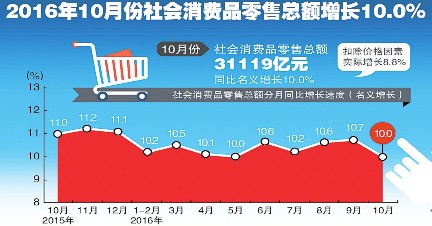 在国务院新闻办公室14日举行的发布会上,国家统计局公布了2016年10月份国民经济运行数据。国家统计局新闻发言人毛盛勇表示,从投资来看,1-10月份固定资产投资同比增长了8.3%,增速比前三季度小幅提高了0.1个百分点,连续两个月都在加快。特别是民间投资,1-10月份增长2.9%,比前三季度加快了0.4个百分点。10月份当月民间投资增长了5.9%,比9月份增速又加快了1.4个百分点。民间投资连续两个月的增速回升,表明市场需求面有所改善,也表明市场内生动力有所增强。 不过,数据显示,10月份消费同比增长10%,较上月回落0.7个百分点,低于市场预期。中国民生银行首席研究员温彬称,居民可支配收入增长放缓或影响消费增长。 中国银行国际金融研究所研究员高玉伟认为,基数因素导致消费增速明显回落。首先,消费拉动增长作用减弱,消费实际增速回落,意味着其对经济增长的拉动减小,将加大稳增长的压力。 汽车消费增速大幅回落。去年10月份,我国开始对购买1.6及以下排量乘用车减半征收车辆购置税。这一政策显著地促进了汽车销售增长,也推高了去年同期的汽车消费基数。今年10月份,限额以上单位汽车零售额同比增长8.7%,增速比上月回落4.4个百分点,导致社会消费品零售总额增速比上月回落约0.6个百分点。也就是说,基数因素成为10月消费增速回落的最主要原因。 居住消费增长有所放缓。9月底及10月初,20多个城市推出新一轮房地产调控政策,对居住消费的影响开始有所显现。今年10月份,限额以上单位建筑装潢材料零售额同比增长12.3%,分别比上月和前9个月回落3.1和1.9个百分点,连续两个月回落;家具零售额同比增长11%,比前9个月回落2.9个百分点。 网上零售增速继续回落。前10个月,网上商品和服务零售额同比增长25.7%,增速比前9个月回落0.4个百分点,连续四个月回落。网上零售虽然增长放缓,但占社会消费品零售总额的比重却转而上升,前10个月占比为11.8%,连续两个月回升。 消费加速增长难度较大。高玉伟说,首先,收入增长放缓不利于消费更快增长。今年前三季度,全国居民人均可支配收入同比增长6.3%,比上年同期下降1.4个百分点。其次,未来两个月基数因素仍将影响消费增长。去年11月和12月,汽车销售增长同样较快、基数较高,未来两个月汽车消费难有更快增长。第三,新一轮房地产调控的政策效应仍将持续释放,不利于居住消费加快增长。总体而言,未来消费稳定增长面临一定压力,难以显著地加快增长。 “扩大内需仍面临一定压力,随着房地产调控政策效应逐步显现,应加快PPP项目落地,托底经济增长。”温彬认为。