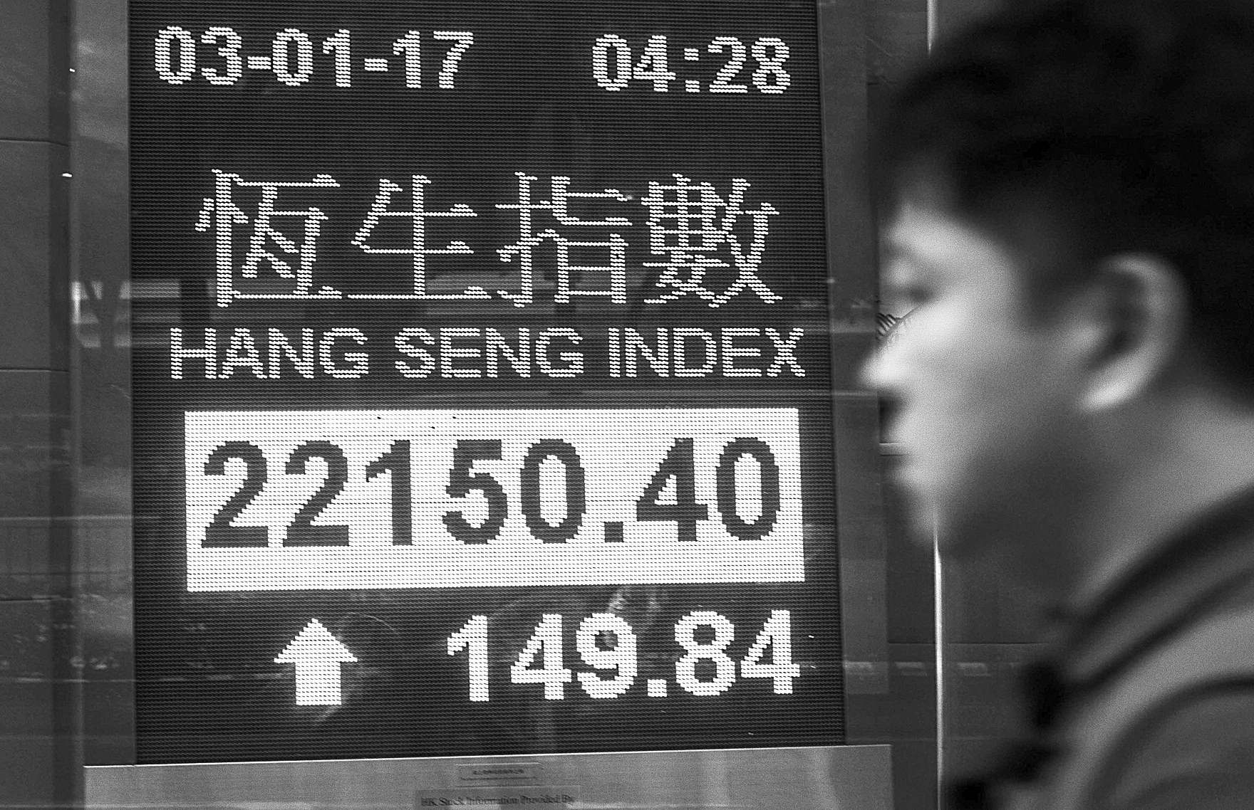 2017年首个交易日,香港股市红盘高收,恒生指数收市上升149.84点,收报22150.40点。图为市民从香港湾仔一家银行的恒生指数电子显示屏前走过。吕小炜/摄