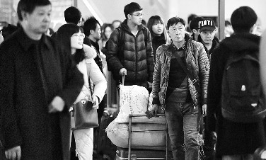 元宵节过后,随着浙江大批制造企业的陆续开工,杭州火车东站迎来了鸡年春运的最后一波返程高峰。图为大批返程旅客经过杭州火车东站出站口。
