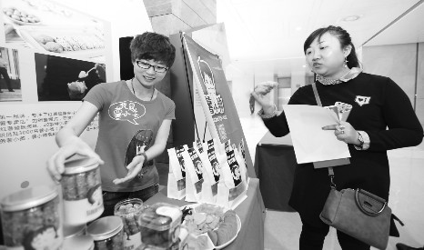 日前,第四届“创青春”中国青年创新创业大赛启动仪式在陕西西安举行,大赛即日起开放报名,不超过35周岁的创业青年和平均年龄35周岁以下的创业团队均可报名参赛。图为一名青年创业者(左)在启动仪式现场向参会人员介绍红薯食品。