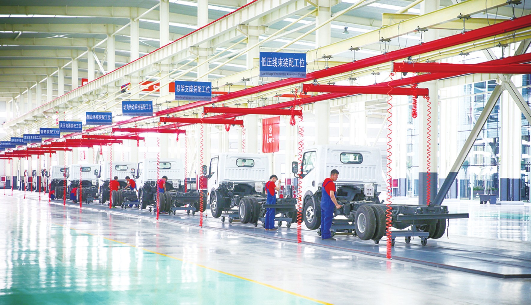图2:烟台市海德新能源汽车公司工人在生产线上忙碌。才扬/摄