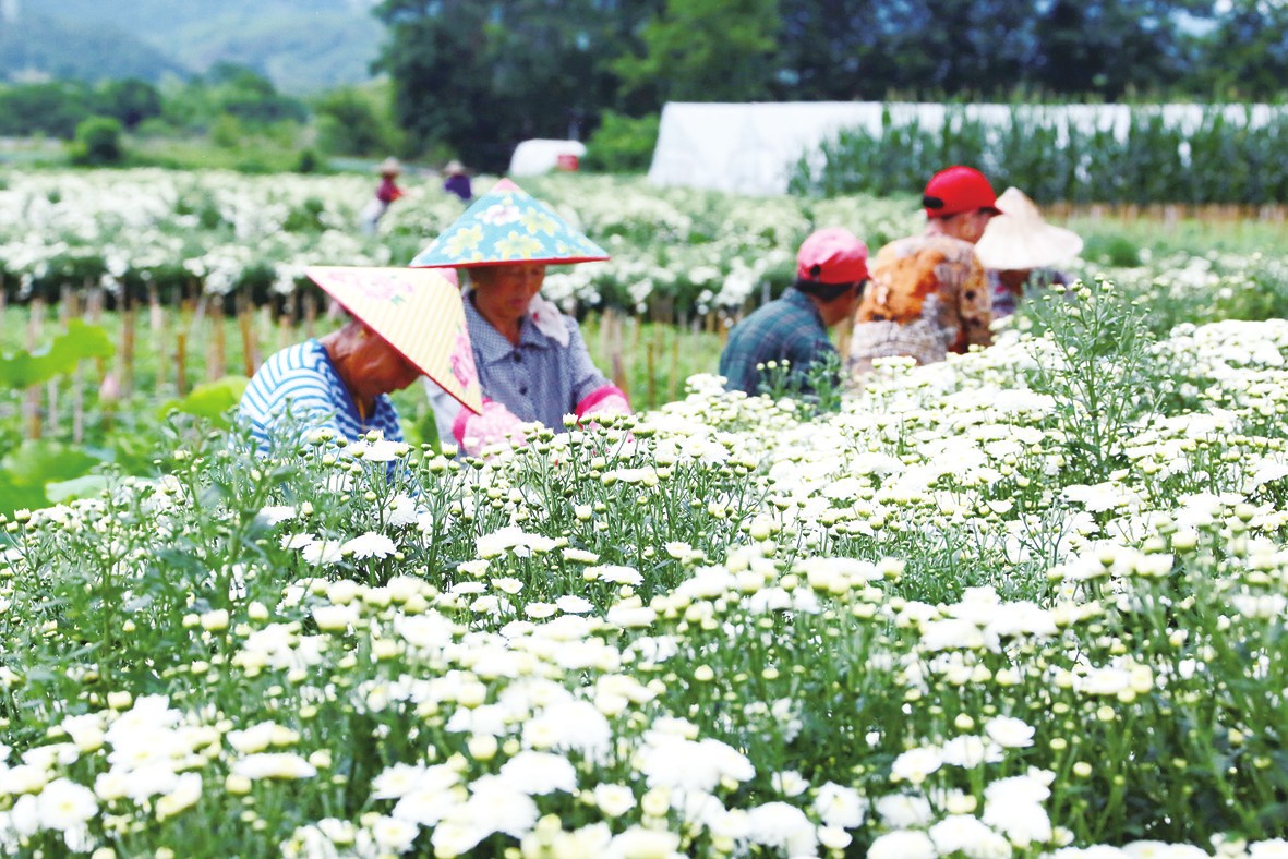 日前,安徽休宁县徽州贡菊进入采摘期,花农们抓紧时机采摘菊花,确保丰产丰收。图为安徽黄山市休宁县盐铺村农民在采摘菊花。潘成/摄