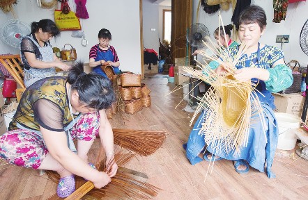 浙江安吉是传统竹产业强县。近年来,当地通过挖掘中国传统文化记忆,吸纳当地农村剩余劳动力,传承竹编、竹雕、竹扇制作技艺,提高工艺制作水平,进一步提升传统竹制品文化内涵。2016年,当地竹产业实现总产值200亿元,从业人员近5万人。图为几名妇女在安吉鄣吴镇一家作坊内编织传统竹制品。