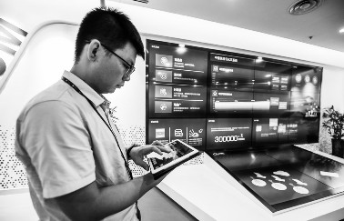 在位于呼和浩特市和林格尔县境内的中国电信云计算内蒙古信息园,一名技术人员在演示大数据应用。中国电信云计算内蒙古信息园具有120万台服务器以上的云计算服务能力,百度、阿里、腾讯、搜狗等众多企业入驻。 自2011年全面启动云计算产业发展战略以来,内蒙古依托自身冷凉气候和丰富的电力资源,推动产业迅猛发展,大型云计算数据中心服务器装机能力已达90万台,全区光缆总长度42万公里,互联网宽带接入端口890万个,北方大数据中心建设初显规模。