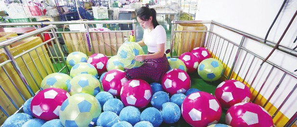 近年来,河南省焦作市武陟县妇联与当地超市和玩具、服装、鞋帽加工等劳动密集型小微企业联动,开拓“巧媳妇工程”就业渠道,通过开展委托加工、订单生产和流水作业等形式,让农村妇女就近灵活就业。2015年以来,全县已建成“巧媳妇工程”就业基地60处,3000余名农村妇女实现家门口就业。图为武陟县贝贝特玩具公司员工许喜梅在抽检玩具球。